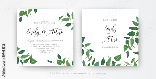 modern, minimalist style leafy wedding invitation, floral invite card design natural eco friendly eucalyptus greenery branches, green leaves decorative illustration vector art botanical template set wall mural alewiena